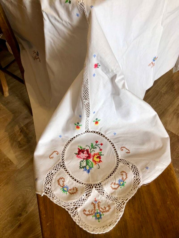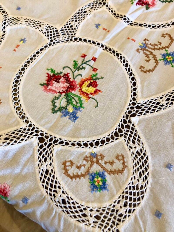 Spectaculaire nappe rectangulaire en coton blanc toute brodée au point de croix et applications de dentelle au crochet. Un rappel du motif dans les angles fini cette beauté.
