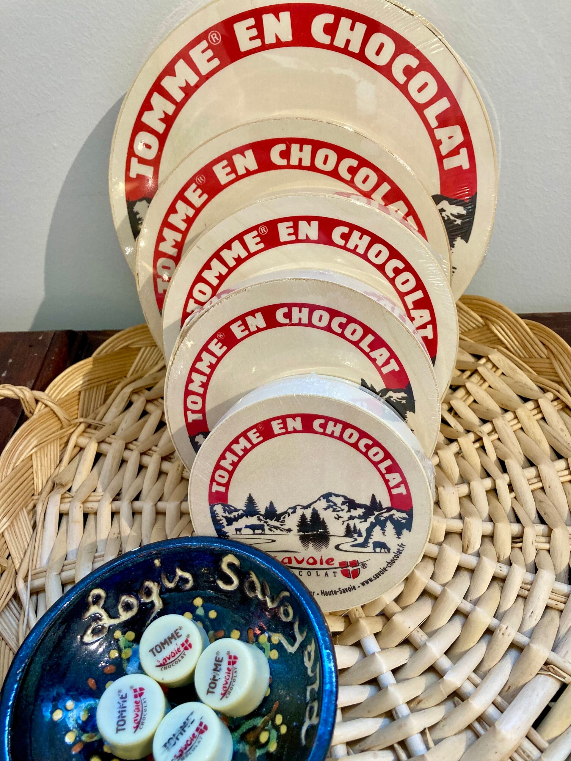 Adorables chocolats en forme de tomme présentés soit en boîte en bois (forme camenbert), soit en boîtes cartonnées.