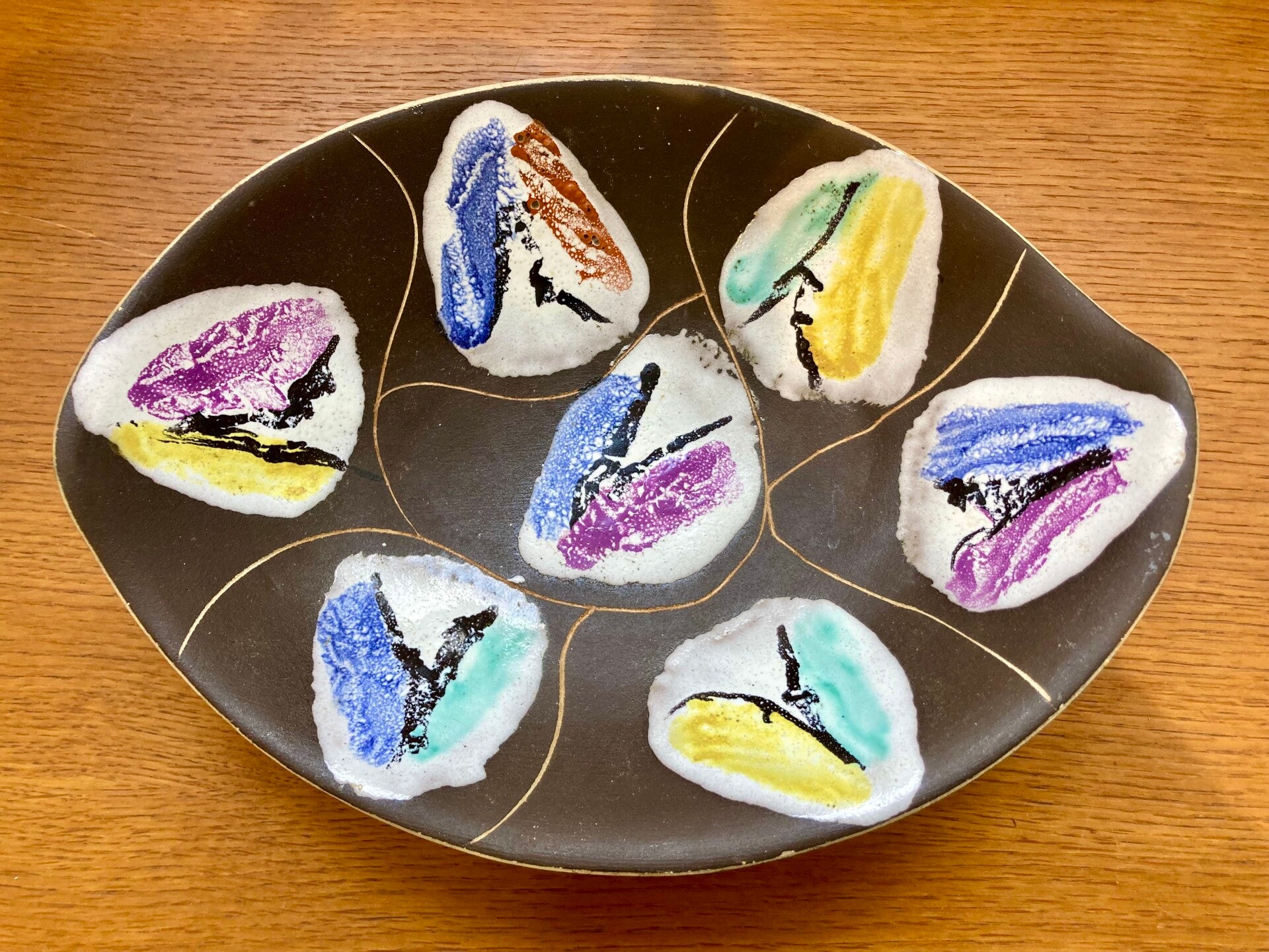 Magnifique coupe en céramique des années 50/60, avec un beau travail de l'émaillage et des couleurs. Son côté design est très actuel et sera du du bel effet sur une table basse ou de salle à manger.