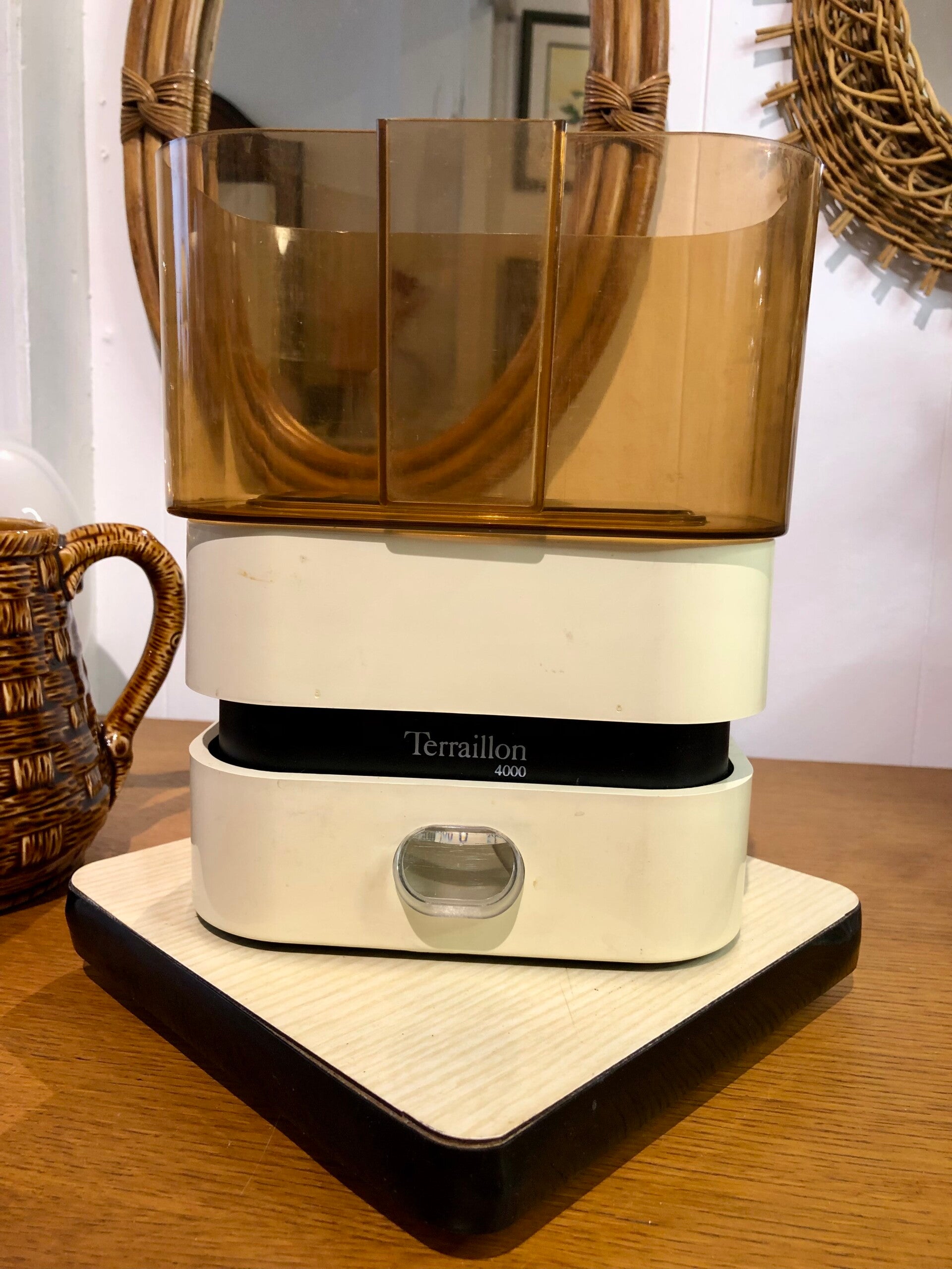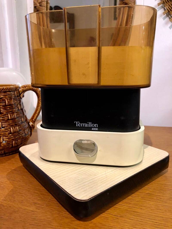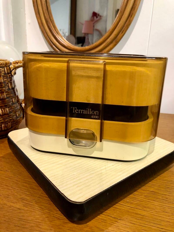 Iconique balance Terraillon des années 70, modèle "Terraillon 4000" beige et noir, avec la partie en plexiglass ambrée, toujours en très bon état, et en état de fonctionnement.