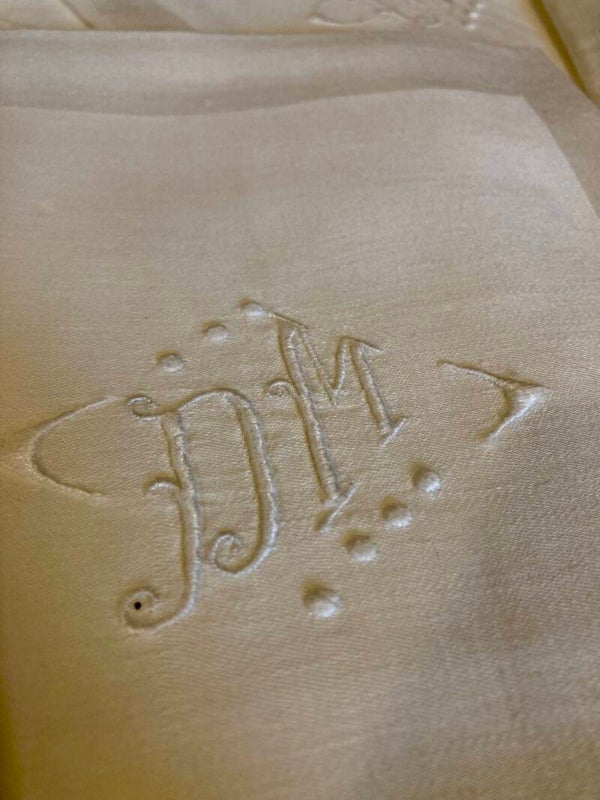 Sublimes serviettes damassées brodées des chiffres DM en fil, d'une grande finesse et grande qualité. Un linge de table comme celui-ci est rare par sa qualité et son état. Finission en jour échelle sur toute la bordure pour souligner et encadrer cet extraordinaire travail de tissage et de broderie.