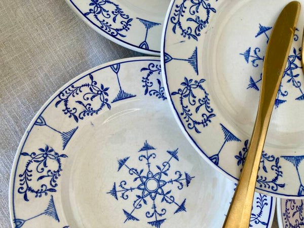 Bel ensemble d'assiettes plates et creuses de la manufacture Moulin des Loups, modèle Saxe, pour une jolie table tout en bleu et blanc.