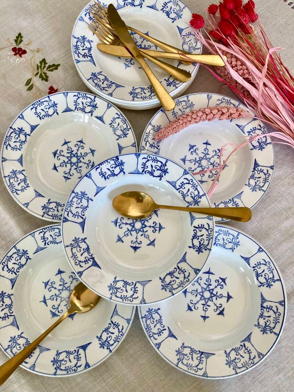 Décor des assiettes d'un beau bleu intense. Disponible 5 assiettes plates et 5 creuses, d'une belle brillance, avec de légères marques du temps, mais ni fêle ni éclat.