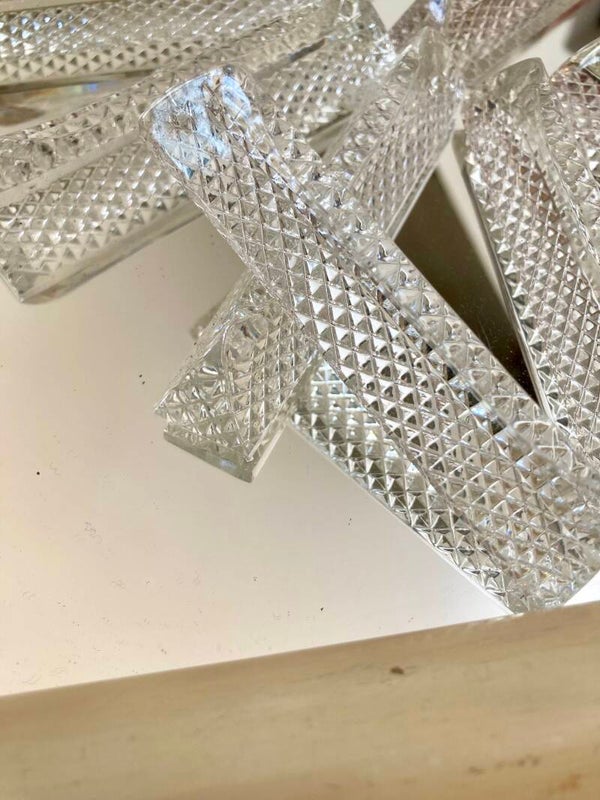 Elégante série de 12 porte-couteaux en cristal taillé en pointe de diamant, et de forme triangulaire. Une façon très chic de mettre en valeur vos plus jolis couverts, mais aussi de protéger votre nappe des taches.