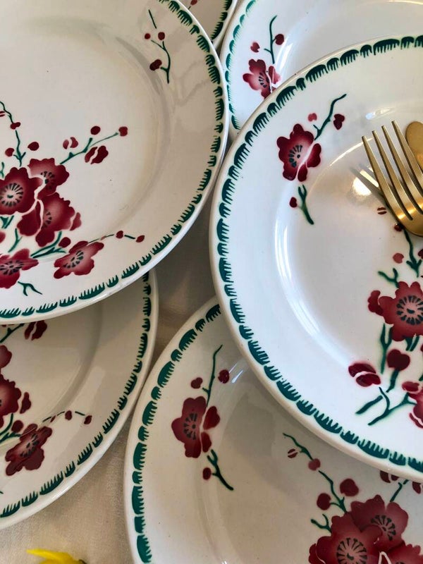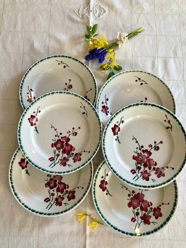 Pour une table aux notes de printemps, voici ces assiettes de la manufacture de Badonvillier, au décor de branches de fleurs de cerisier et aux harmonies de vert sapin et bordeaux.