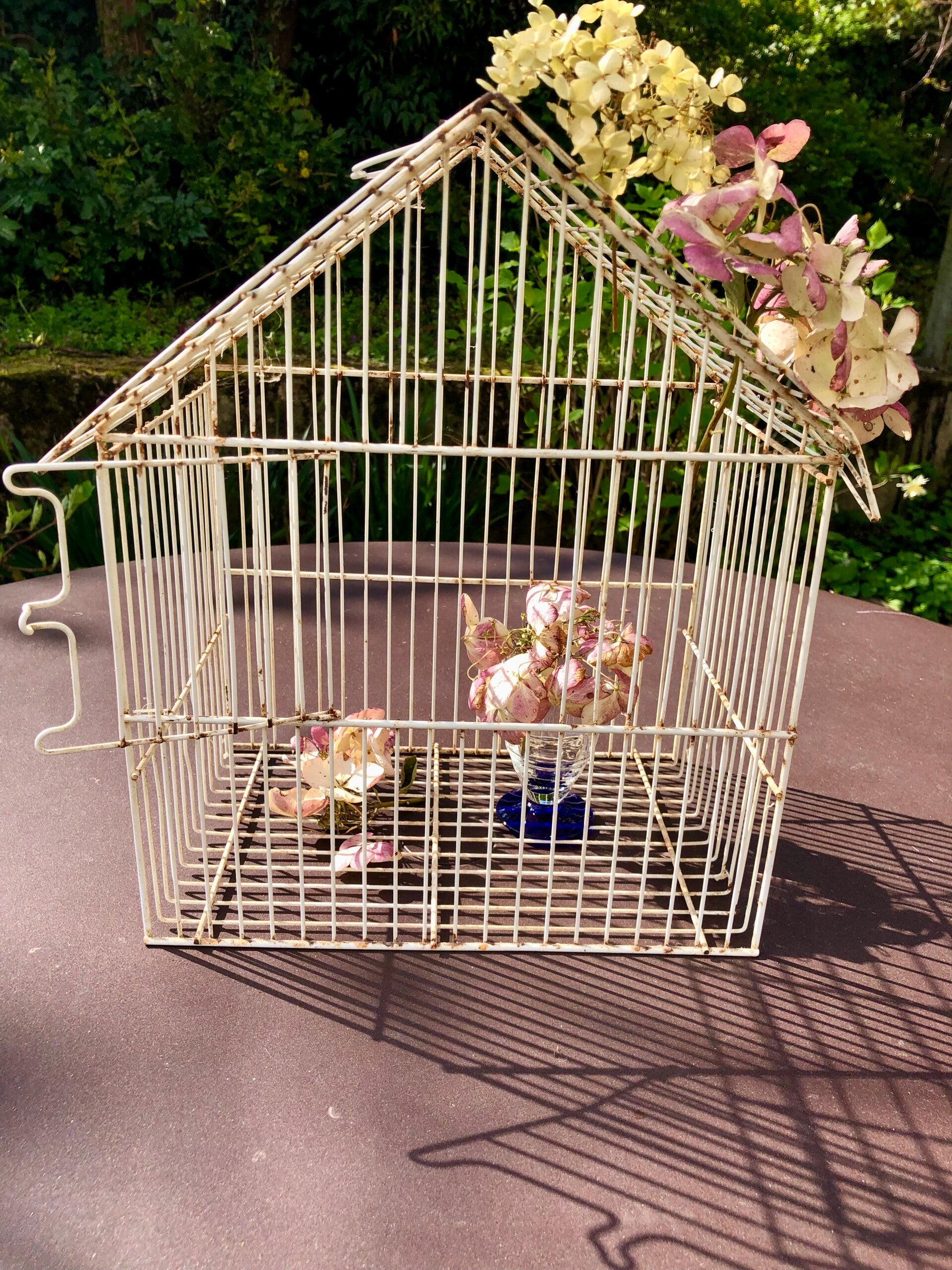 Très déco ces cages à oiseaux vintage, en métal peint en blanc, avec leurs marques du temps qui leur donnent tout leur charme.