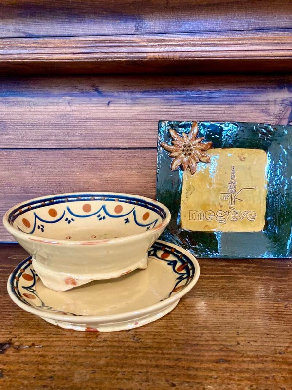 Rare égouttoir à fraises en poterie savoyarde de la célèbre poterie de Marnaz, jamais utilisé, et toujours utilisé en décoration, typique de la production de la poterie. L'assiette du dessous est signée.