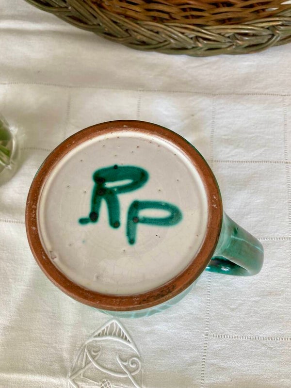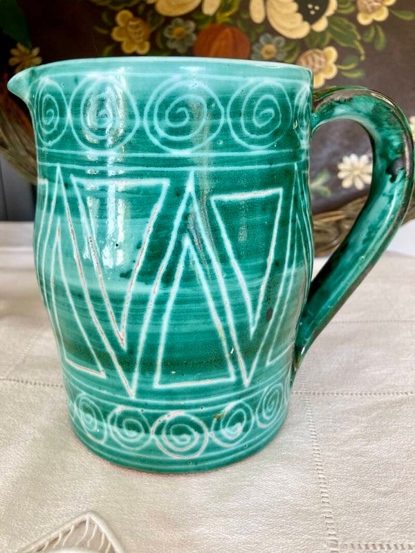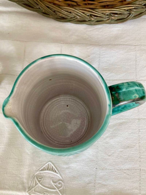 Rare pichet du célèbre et côté céramiste de Vallauris Robert Picault, au décor scarifié vert (typique de ses oxydes de cuivre) et blanc. C'est une production des années 50.