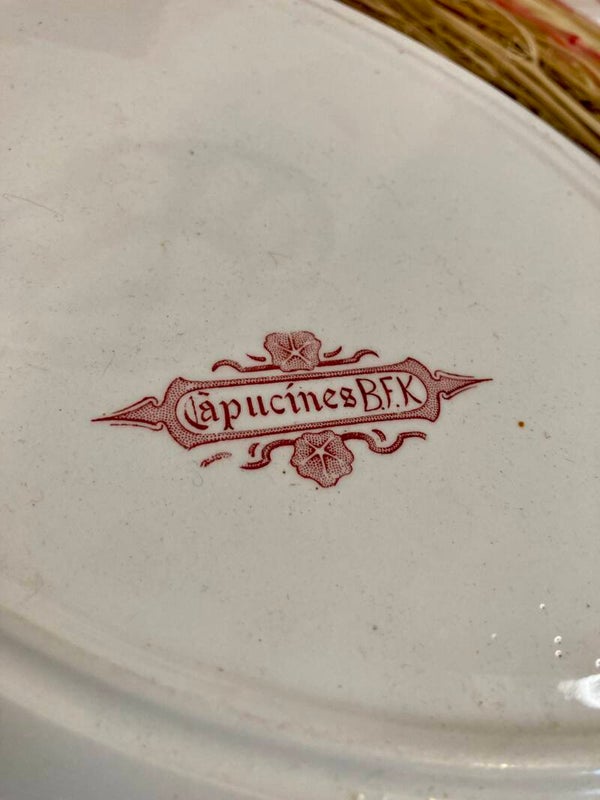 Un service exceptionnel en Terre de Fer de la fin du 19ème siècle avec son décor caractéristique de la période Art Déco, et aussi appelée "Nouille". Un entrelas de fleurs de capucines, d'où son nom, et une couleur entre le bordeau et le rose, en fait toute la douceur. La manufacture Boch Frères Kéramis est le créateur de ce joli service.