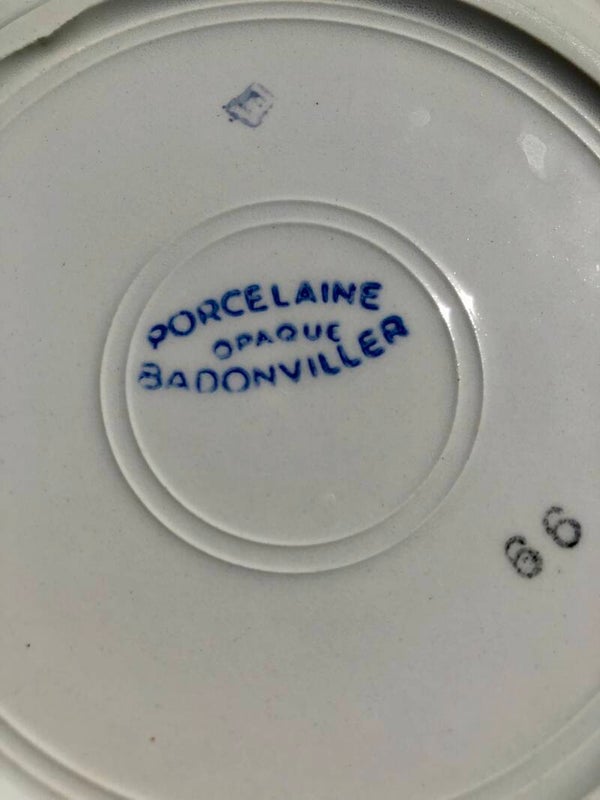 Ici nous avons des assiettes creuses des manufactures Badonvillier et Gien, 3 de chaque, toutes en excellent état, belle brillance et qualité des décors, ni fêle ni éclat.