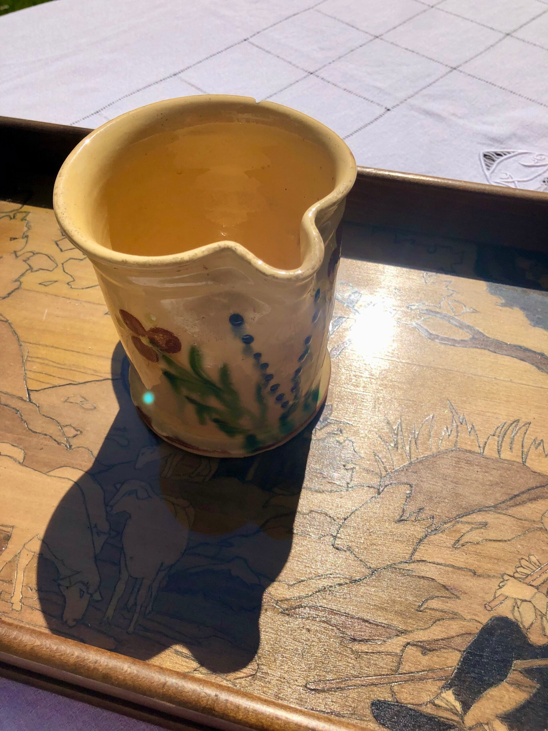 Joli pichet savoyard réalisé pour une commande spéciale, ce qui le rend encore plus unique. Daté de 1997, il fut réalisé pour les vétérans, ce qui le charge d'émotion et de respect. Un petit éclat au col à signaler, comme souvent sur ces poteries.