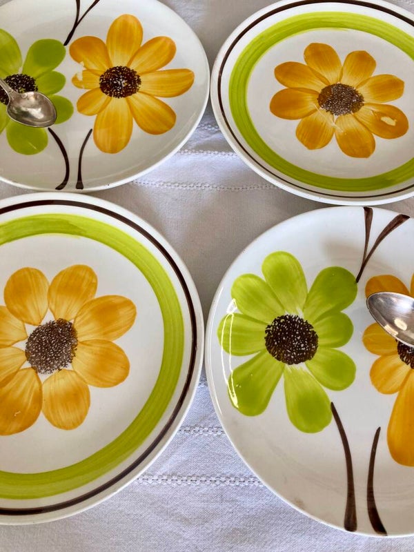 Très belles assiettes à dessert fleurs vintage en faîence Gien, peintes à la main, pour mettre une touche colorée et fleurie sur votre table au moment de l'entrée ou du dessert.