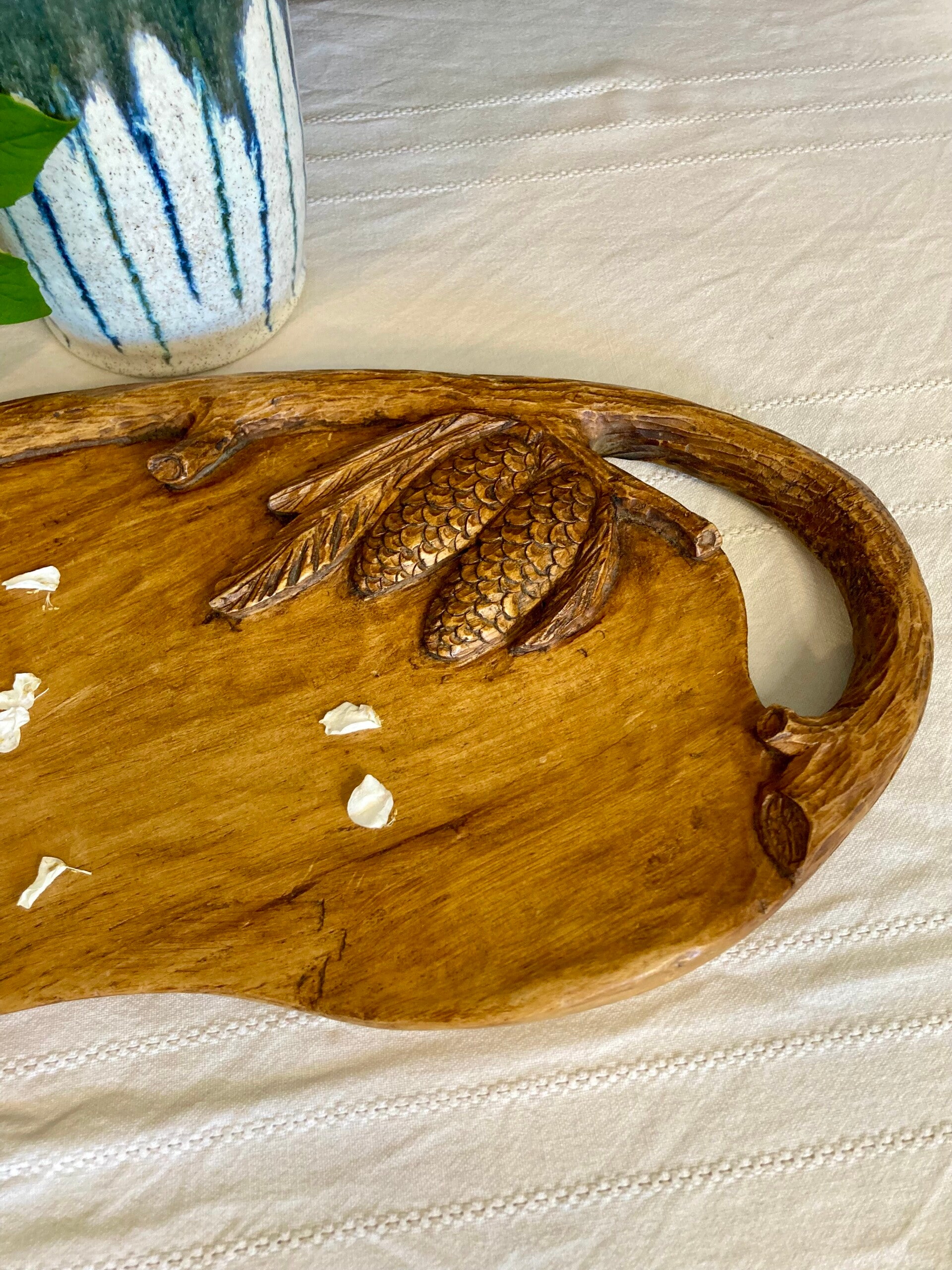 Superbe plateau en bois sculpté dans un style montagne très ouvragé, un peu dans le style des objets de la "Forêt Noire". Un plateau parfait pour une présentation de charcuterie ou de fromages. Mais son usage peut aussi très bien convenir pour un vide poche.