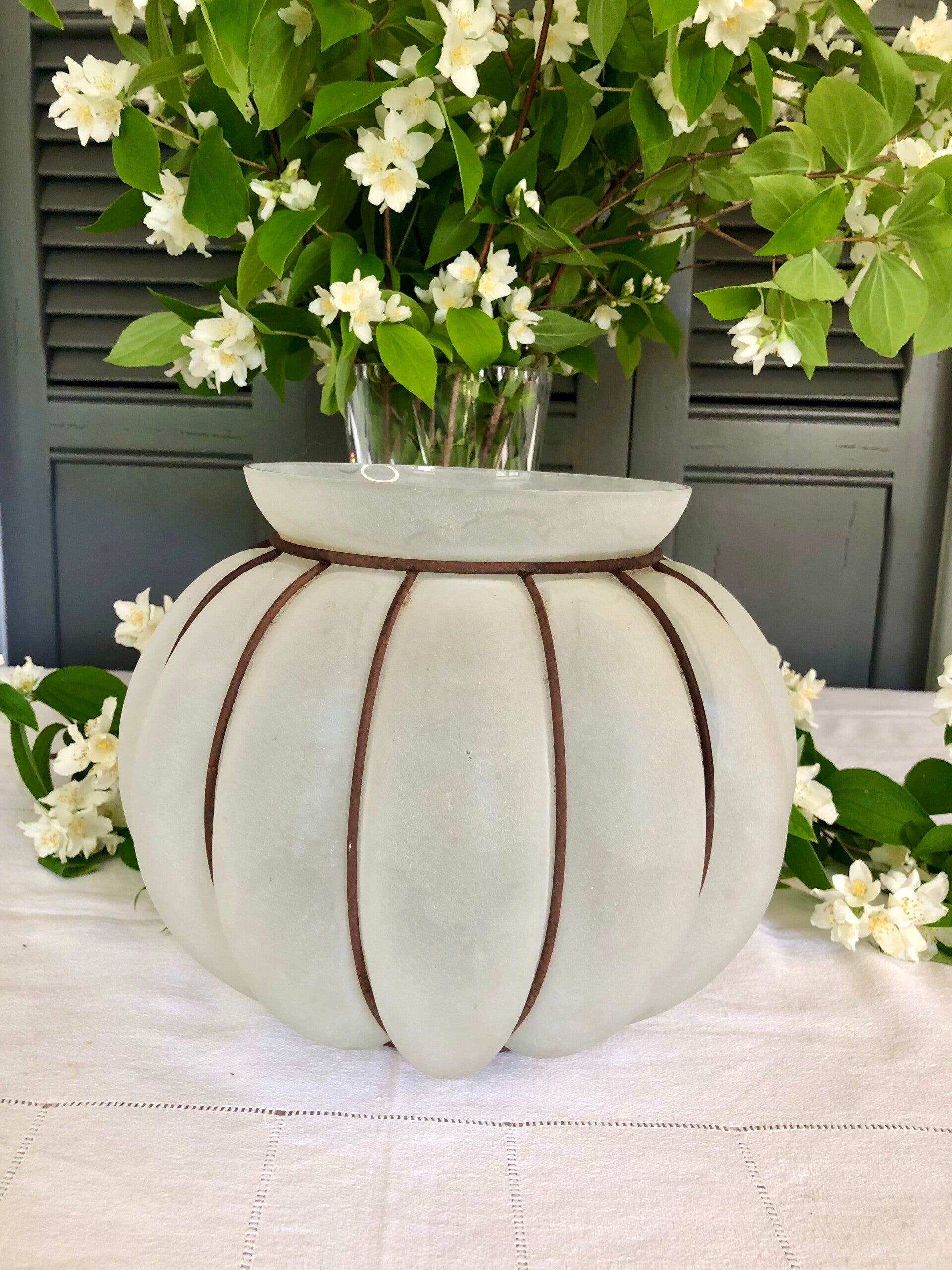 Superbe grand vase boule Art Déco en verre givré soufflé dans une structure en métal, dans l'esprit de la collaboration de Louis Majorelle et Daum. Très actuel dans la forme et la couleur, superbe par sa taille, il est aussi en parfait état avec une patine rouillée du métatl qui lui donne encore plus de charme.