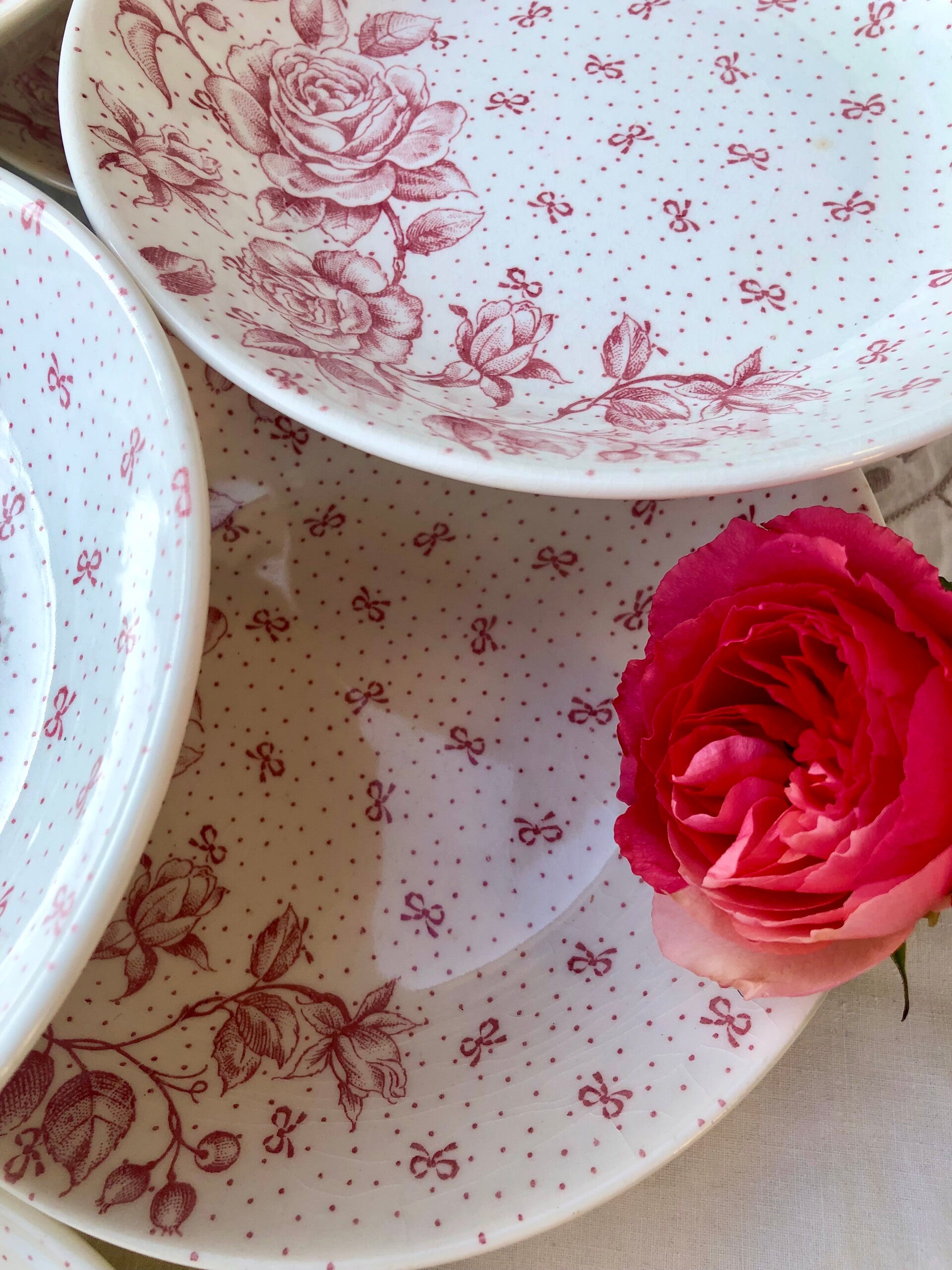 Magnifiques assiettes creuses calotte en faïence de Gien, guirlandes de roses et charmants petits noeuds qui terminent le décor.